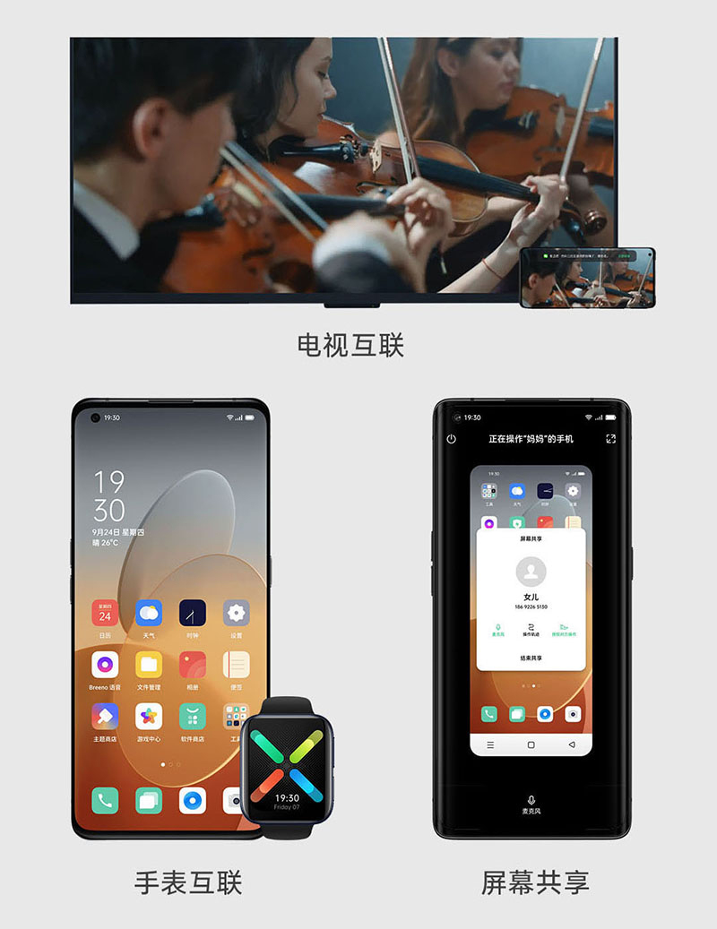 多终端互联互通,手机与手机互联,不仅能共享对方手机界面,还能远程协助对方手机进行操作;手机与手表互联,支持信息同步、手表接听电话、收发信息等;手机与电视互联,在电视上进行快捷投屏时,手机隐私信息将会被自动过滤。