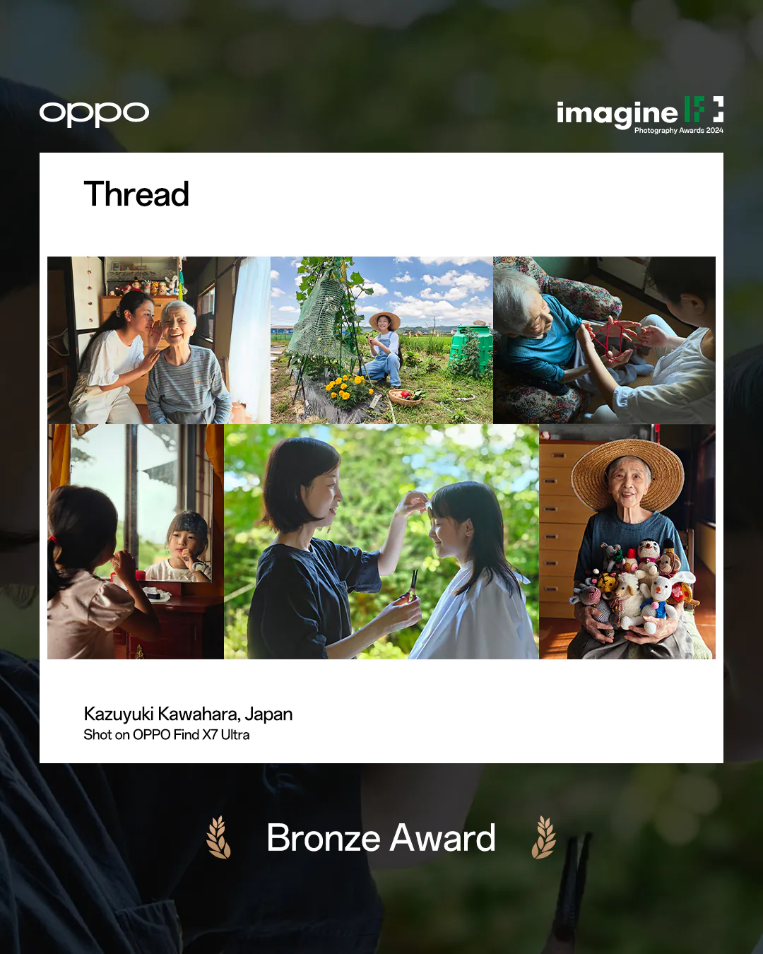 From a Chinese city to the Japanese countryside, "Thread" by Kazuyuki Kawahara—a Bronze Award winner—takes us into the intimate world of family bonds. With OPPO's Find X7 Ultra, Kawahara captured a poignant scene featuring his daughters and their grandmother, who is living with Alzheimer's disease. The three generations share a day in their ancestral home, where they spent abundant time revisiting the grandmother's fading memories.