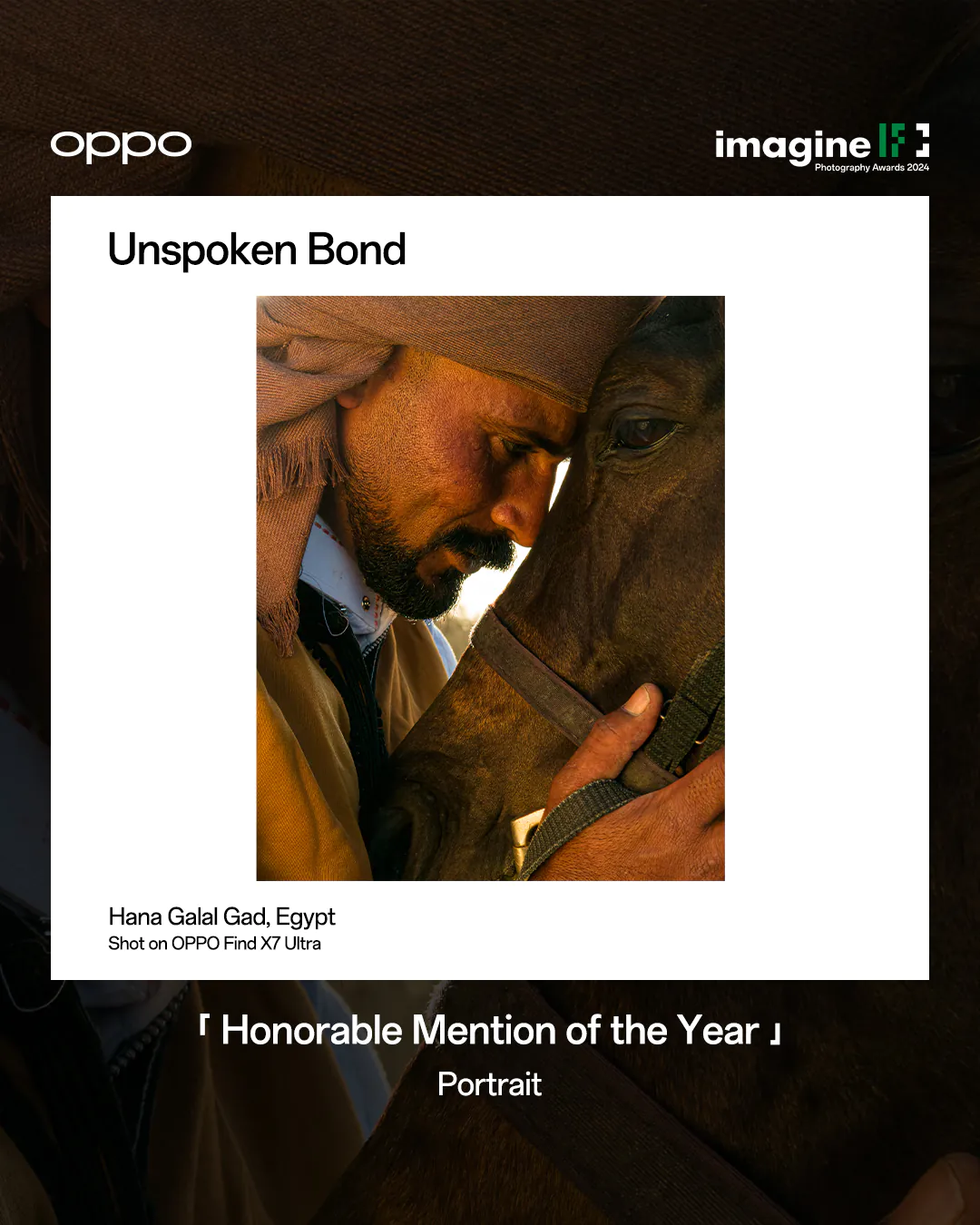 In the language of photography, love isn't spoken but vividly captured. Similarly, in "Unspoken Bond" by Hana Galal Gad from Egypt, a poignant connection between man and horse is captured in a simple yet profound portrait. This piece, recognized in the Portrait category, echoes Gad's own memories of horseback riding in her youth—a student evading her father and school to ride horses, now reflected in her role as a parent facing her child who escapes to the open fields much like she once did, where joy on horseback is found. For Gad, OPPO's imaging technology brings out the story within each image, combining precise details and natural light to create an emotional impact that feels authentic.