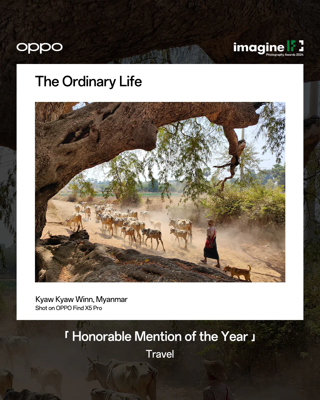 In the remote countryside of Myanmar, a cowboy leads his cattle to greener pastures, with his loyal dog trailing closely by his side. This simple yet powerful image, "Ordinary Life," by Kyaw Kyaw Winn, celebrates the beauty of daily life and cultural heritage. Recognized in the Travel category, Winn's photo captures the harmony of Myanmar's rural lifestyle-a perspective on life rarely seen but universally relatable.