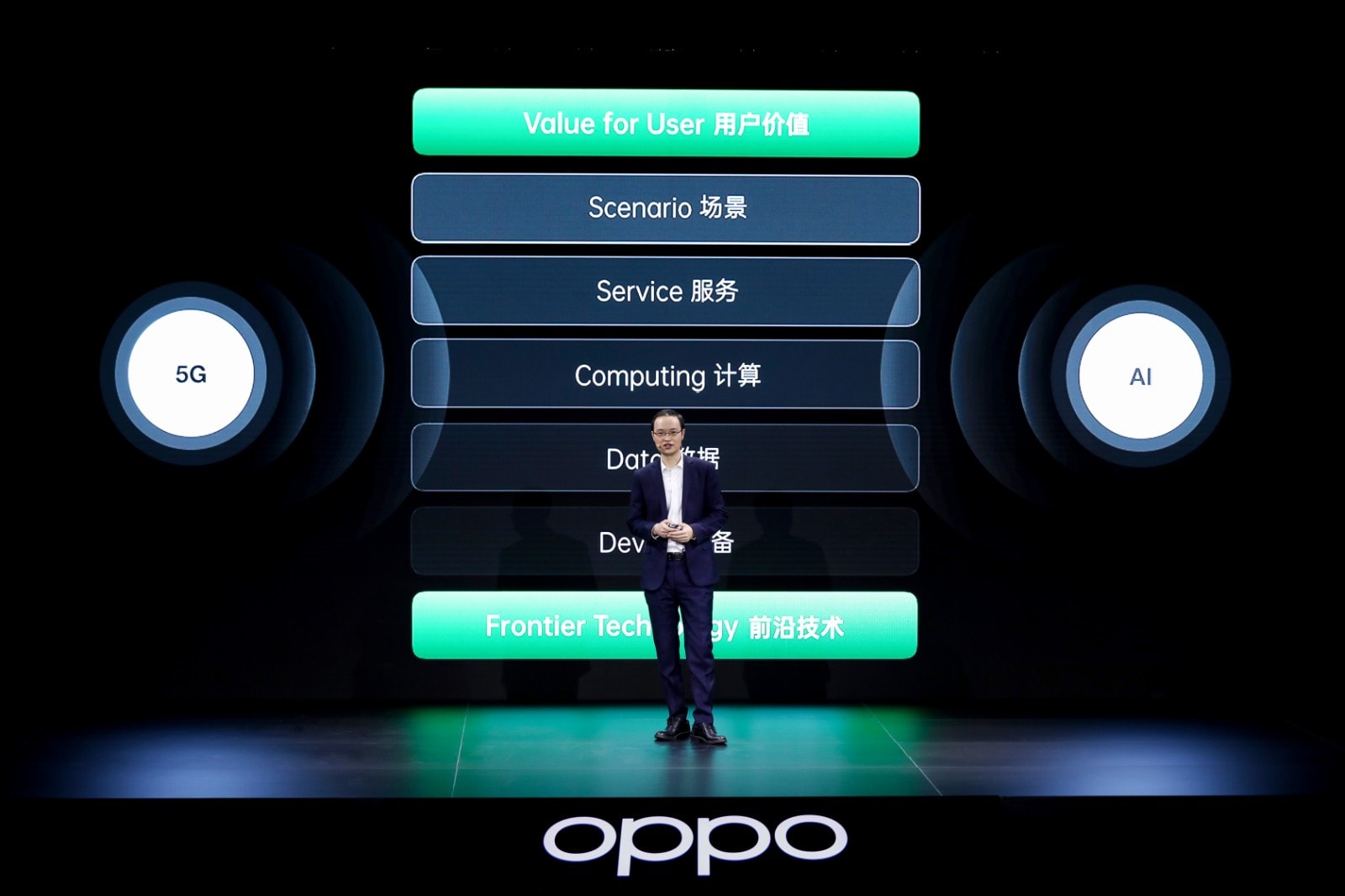 刘畅认为,技术服务互融的必然性与必要性已经凸显,OPPO 已搭建起互融式技术体系,涵盖设备、数据、计算、服务和场景五大链条,5G 和 AI 作为基础设施与核心能力贯穿其中,形成技术共振,可提供完整且一致的科技体验。OPPO 将以覆盖个人场景、垂直场景和融合场景的“三圈场景模型”布局未来终端形态。