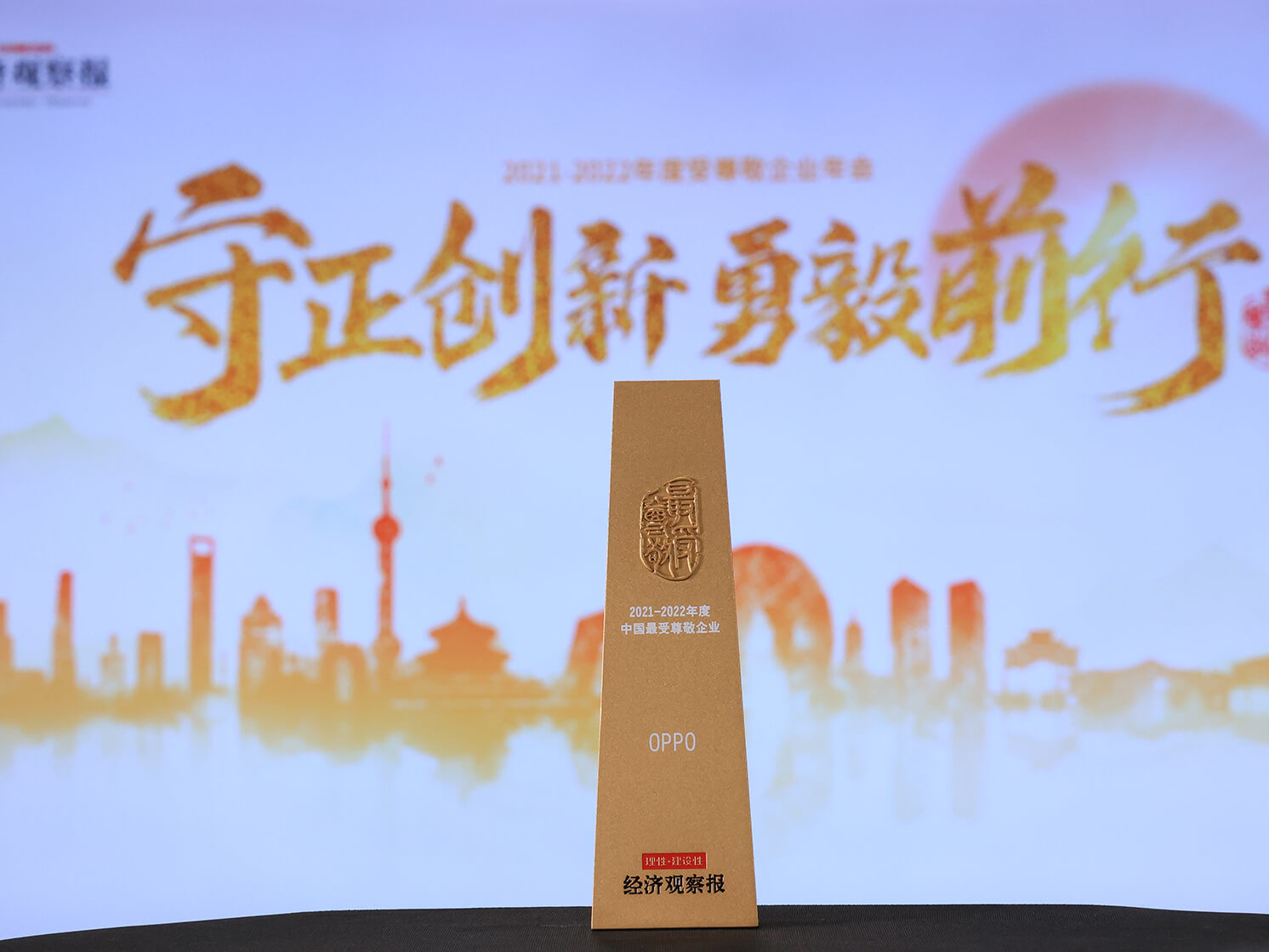 12月29日,在《经济观察报》主办的“守正创新、勇毅前行”2021-2022年度中国受尊敬企业年会上,OPPO获得“2022年度受尊敬企业”称号。这也是OPPO第六年获得该荣誉。