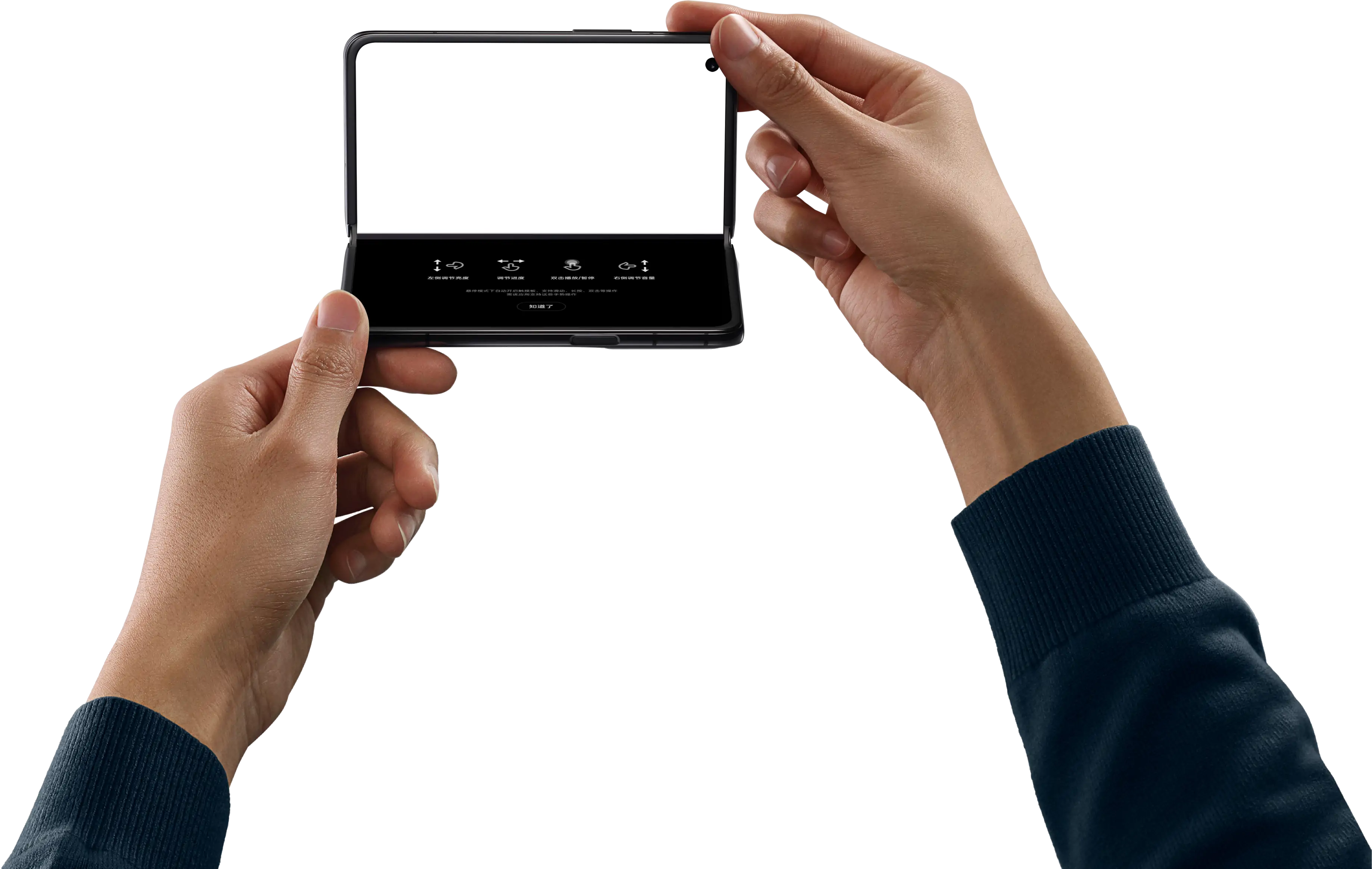 一手掌握指该产品在内部调研测试中,从交互规范的比例数据与用户握持舒适的比例数据中取得平衡,以此作为该产品打开、合上宽度尺寸的设计原点。