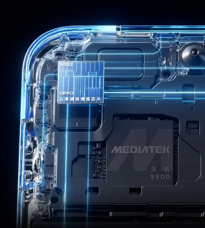 23. 天线长度对比 Find X8 系列低频天线长度。通信测试结果均来自 OPPO 实验室,因测试环境、方法等不同,数据可能存在差异。R100 为芯片名称,图例为芯片示意,仅作参考,请以实际使用为准。