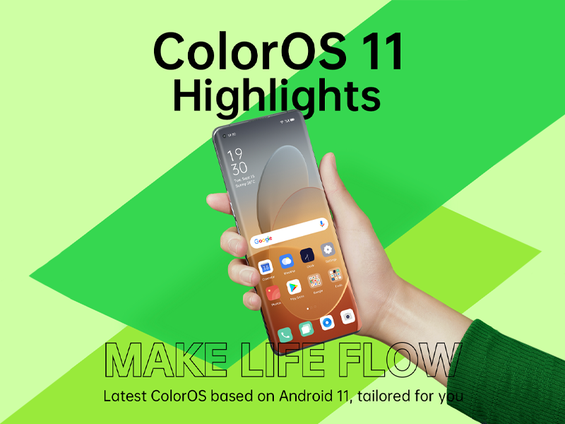 يحافظ نظام تشغيل ColorOS 11، والذي يحمل مفهوم "دع الحياة تتدفق"، على مزايا أندرويد المحببة بينما يقدم تخصيصاً غنياً لواجهة المستخدم التي يبحث عنها مستخدمو هواتف OPPO. يقدم النظام الجديد مستوى غير مسبوق من تخصيص واجهة المستخدم لمساعدة المستخدمين على إطلاق العنان لخيالهم وتخصيص تجربتهم. يمكن أن يقوم المستخدمون بتصميم شاشة العرض الدائم الخاصة بهم، والنمط، والألوان، وخلفية الشاشة، إلى جانب الخطوط ، والأيقونات، والنغمات. نظام ColorOS 11 يحسن أيضاً من سمات الوضع المظلم لأندرويد مع ٣ أنماط لونية ودرجات مختلفة من التباين. كذلك، تساعد خاصية OPPO Relax 2.0 المستخدمين على عمل مزيجهم الخاص من الضوضاء البيضاء بينما تقدم مجموعة موسعة وغامرة من أصوات المدن حول العالم.