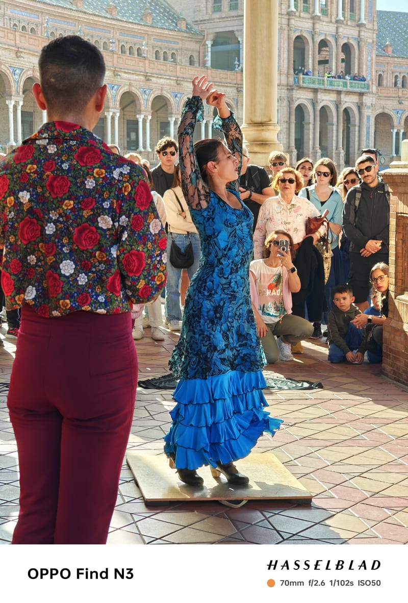 Flamenco dancers are challenging subjects, making Find N3's incredible Hasselblad camera the perfect tool for the job. Thanks to its large sensors and strong stabilization capability, Find N3's system creates natural depth, preserving facial expressions and helping critical elements pop with a subtle, tasteful, soft-focus background.