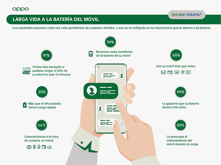 Madrid, abril de 2022. Según un estudio social sobre el uso y los hábitos de las baterías y los teléfonos móviles realizado por OPPO por segundo año consecutivo, marca líder de dispositivos inteligentes a nivel mundial, y Toluna Start, compañía especializada en investigación online, a una muestra de 1200 personas, podemos decir que los españoles estamos cada vez más pendientes de nuestros dispositivos móviles y a la duración y cuidado de sus baterías.