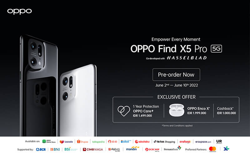 Selain itu, khusus untuk pemegang kartu Mastercard dapatkan juga manfaat berupa potongan sebesar IDR 250.000,- setiap pembelian OPPO Find X5 Pro 5G dengan kartu Mastercard dari bank yang berpartisipasi di e-commerce dengan syarat dan ketentuan yang berlaku. Program ini berlaku pada 2 – 10 Juni 2022.