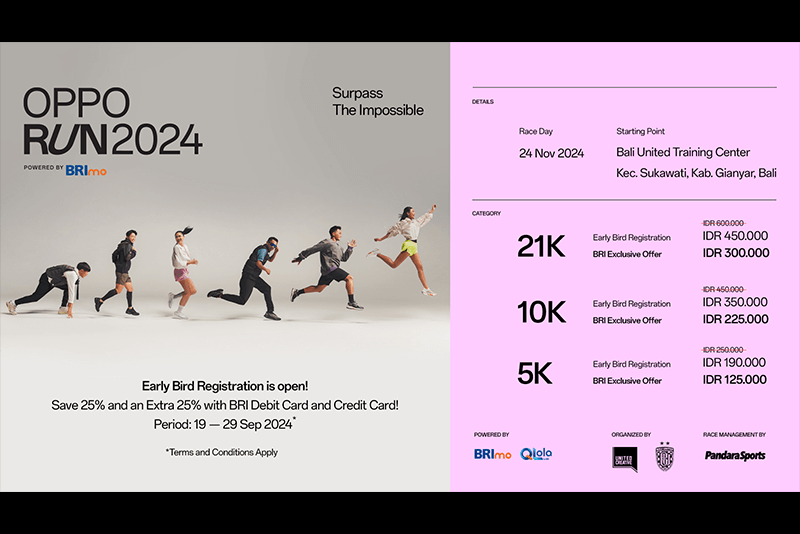 Dengan target peserta mencapai 5.000 orang, OPPO Run 2024 akan menjadi salah satu event lari terbesar di Bali yang menginspirasi masyarakat untuk lebih aktif, sehat, dan bersemangat dalam menjalani gaya hidup yang lebih baik. Calon peserta dapat segera manfaatkan kesempatan periode early bird untuk mendapatkan tiket dengan harga spesial dan bergabung untuk merasakan pengalaman lari yang baru di acara lari paling dinantikan di Bali.