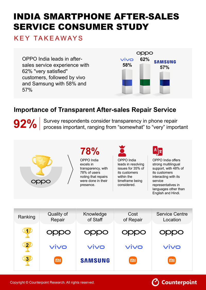 ● After-Sales Experience: 62% of OPPO India customers were 'very satisfied' with the after-sales service centre experience, followed by vivo and Samsung 58% and 57%, respectively.