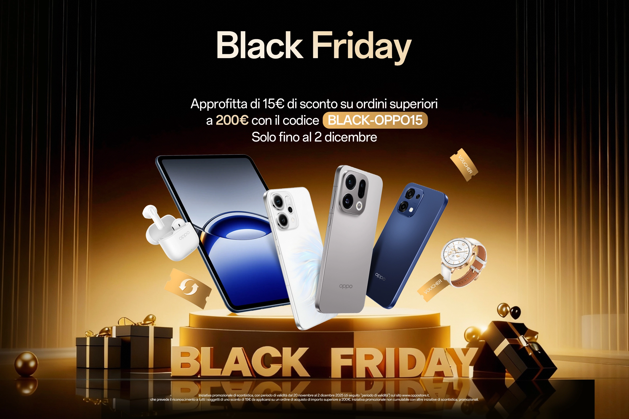 Milano, 20 novembre 2025-OPPO, tra le aziende leader nel settore degli smart device, annuncia una nuova serie di offerte dedicate al Black Friday 2025, disponibili su OPPO Store da oggi, 20 novembre, fino al 2 dicembre, accompagnate quest'anno anche da una speciale livestream su TikTok con prezzi esclusivi e un coupon dedicato. Un'iniziativa pensata per permettere agli utenti di accedere a tecnologie innovative e a un ecosistema completo di dispositivi a condizioni particolarmente vantaggiose.
