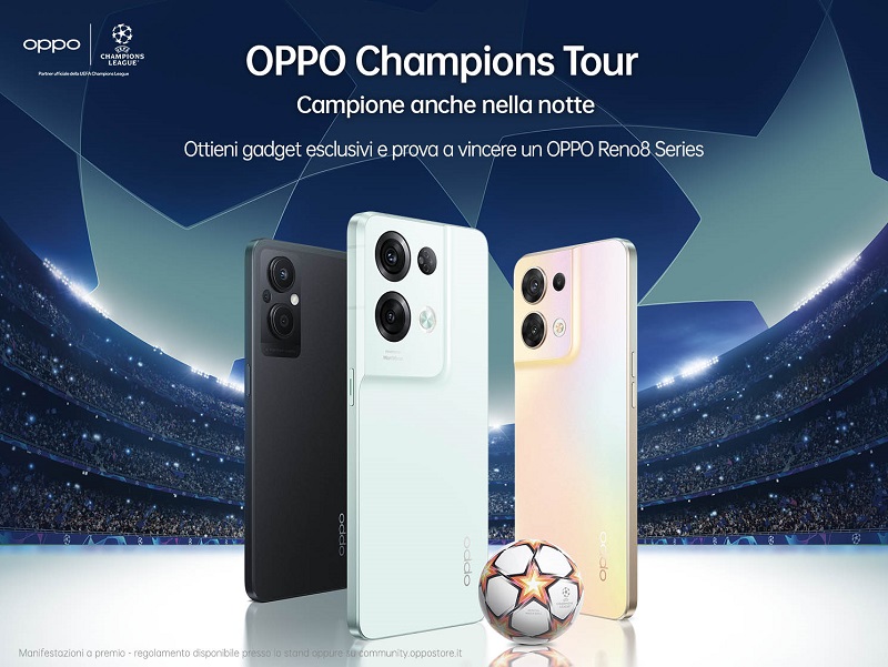OPPO, tra le aziende leader al mondo nel settore degli smart device, annuncia oggi la partenza dell’OPPO Champions Tour, un viaggio itinerante che da lunedì 19 settembre animerà per le prossime settimane i centri commerciali di 4 diverse città italiane: Roma, a seguire Marcianise (Caserta), Torino e Arese (Milano). Quattro tappe diverse in cui OPPO sarà presente con uno spazio dedicato per portare l’esperienza unica della UEFA Champions League ai visitatori, che potranno così viverla in prima persona e scoprire le novità dell’azienda, oltre a testare e provare a vincere uno dei prodotti della nuova Serie Reno8 insieme a fantastici gadget.
