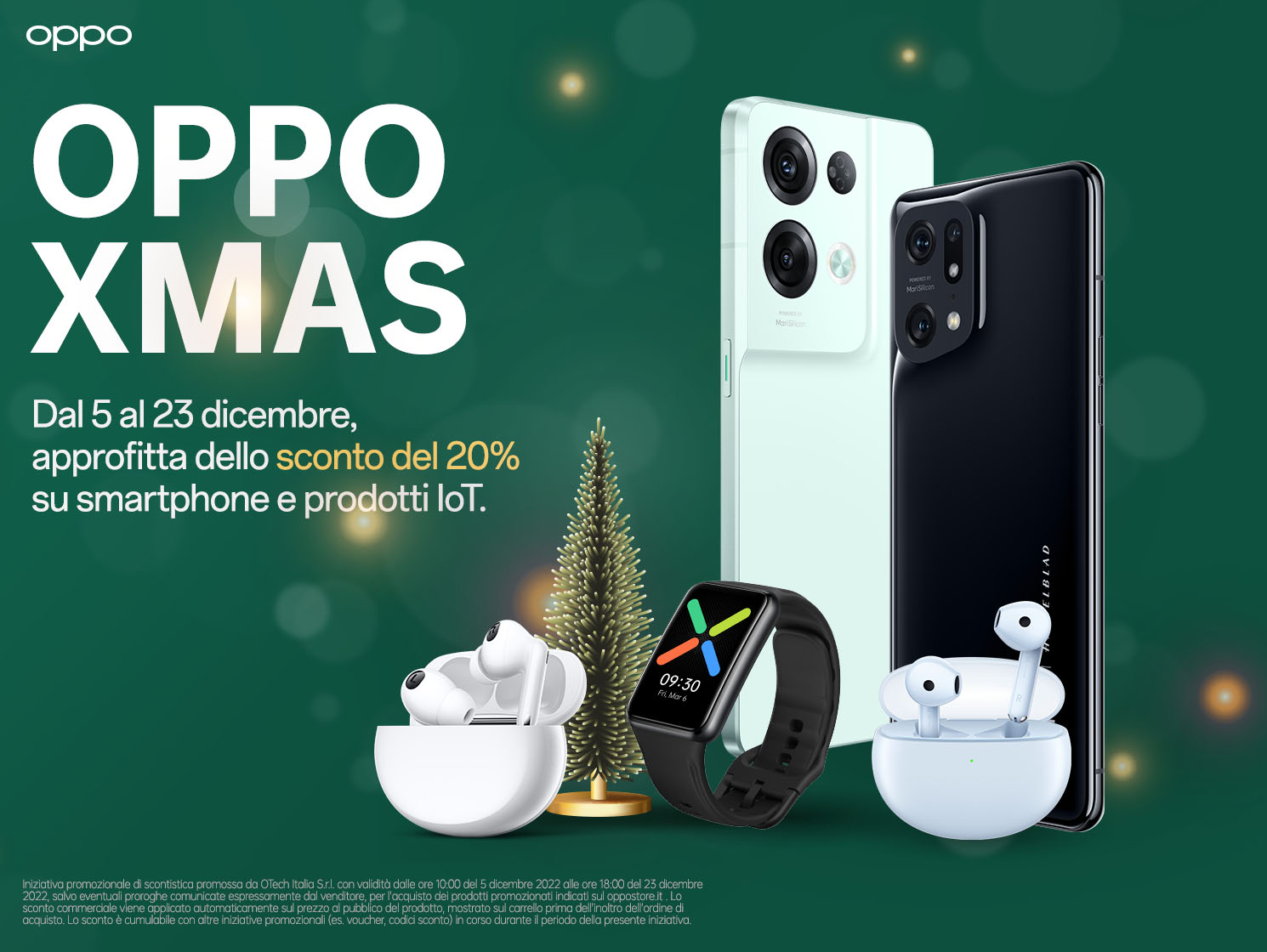 OPPO, tra le aziende leader al mondo nel settore degli smart device, in vista del Natale, regala ai suoi utenti una serie di promozioni su numerosi prodotti del suo ecosistema. Dalle ore 10.00 di oggi, 5 dicembre 2022, fino alle 10.00 di venerdì 23 dicembre 2022, solo su OPPO Store, iniziano gli OPPO Xmas Days: un mese di sconti vantaggiosi su smartphone, dispositivi IoT e prodotti in bundle per arrivare il giorno di Natale con il regalo perfetto per i propri cari.