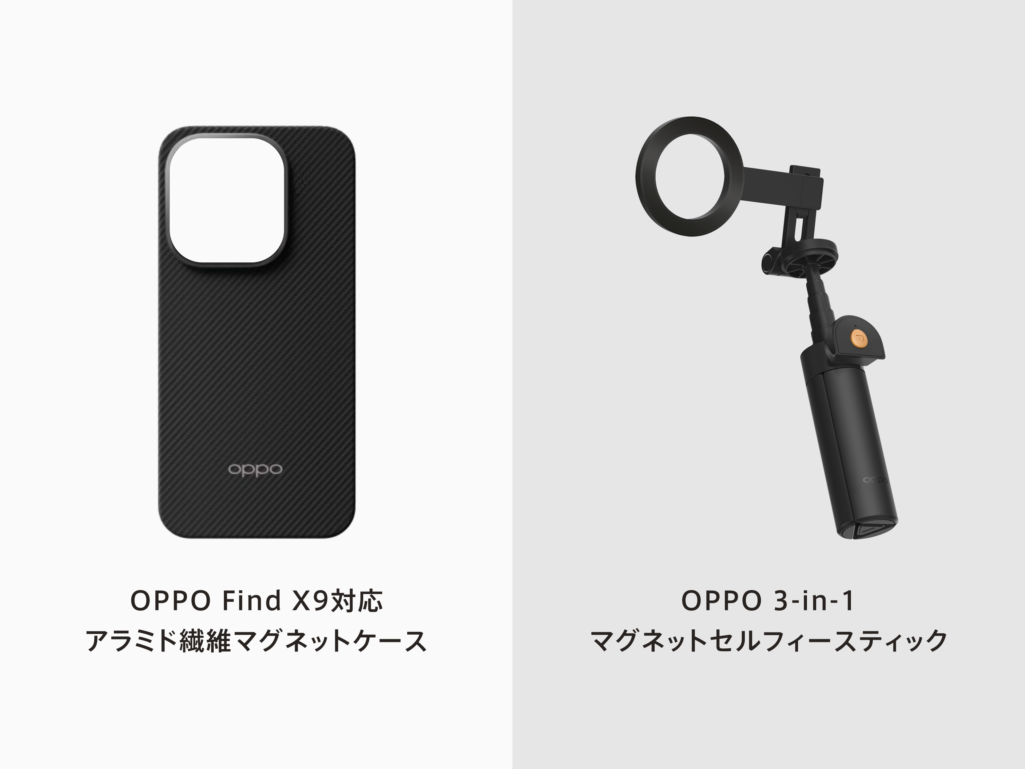 OPPO Find X9専用の「OPPO 3-in-1マグネットセルフィースティック」と、「OPPO Find X9マグネット対応アラミド繊維ケース」も同時発売します。