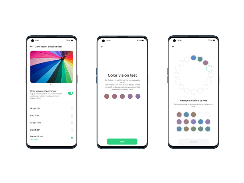 また、色覚障害は男性の12人に1人、女性の200人に1人が罹患すると言われています。ColorOS 11のカラービジョンエンハンスメントはOPPOが100の色相テストから包括的なカラーシステムを作成し、すべてのユーザーの目に最適な色補正を想定した765種類のスクリーンキャリブレーションを搭載しています。