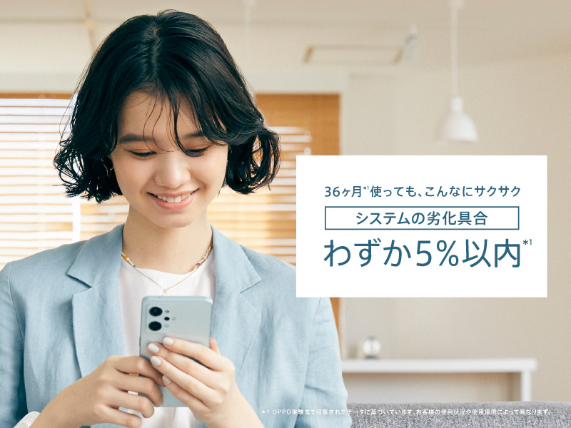 OPPO Reno7 A は、“生活の一部であるスマホを、より長く使い続けられるように”という思いを込めて、デザインだけでなく、ソフトウェアにも新機能を搭載し、36ヶ月使用しても持続するサクサクな操作感を実現しました。