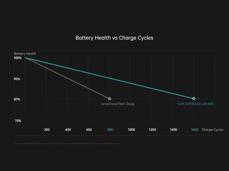 急速充電技術「150W SUPERVOOC」は、OPPO独自のバッテリーヘルスエンジン(Battery Health Engine以下BHE)を統合することで、1,600回充電を繰り返しても元の80%の容量を維持することができます。これは従来の製品標準の2倍にあたる回数で、バッテリー寿命の長期化と高度な急速充電の両方を実現しています。