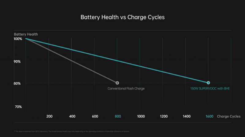 OPPO has integrated its self-developed BHE within the ultra-fast 150W SUPERVOOC flash charge, allowing the battery to maintain 80% of its original capacity after as many as 1,600 charge cycles, double the current industry standard, thus providing extremely fast charging in addition to the battery’s health protection.