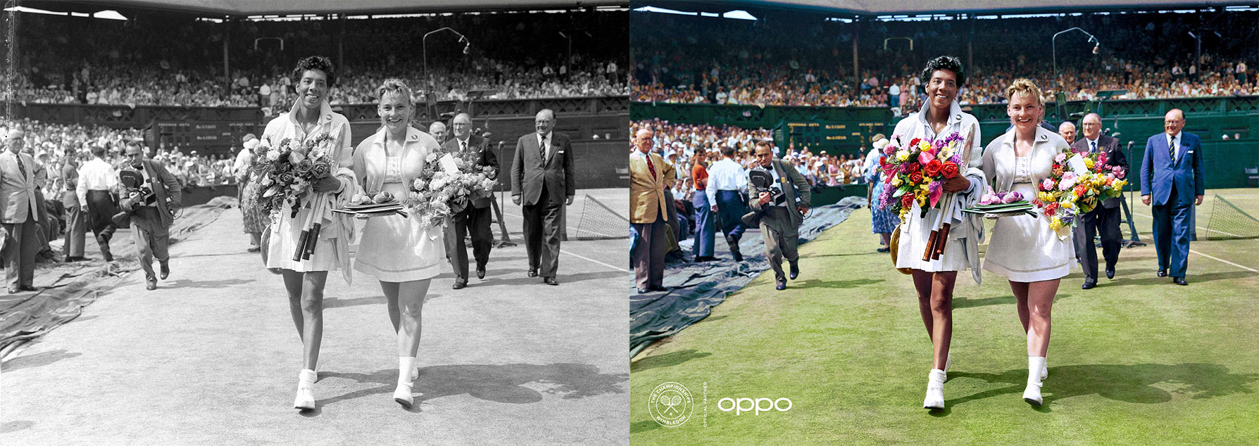 Samen met OPPO's beeldverwerkingsmogelijkheden onderging elke foto een restauratieproces door experts van Getty Images. De Courting the Colour-tentoonstelling van zeven beelden toont de eerste Afro-Amerikaanse atleten die Wimbledon wonnen, Althea Gibson en Arthur Ashe, en brengt nieuw leven in hun continue veerkracht ten opzichte van de sociale onrechtvaardigheden van hun tijd. Beelden van Suzanne Lenglen, Helen Jacobs en Fred Perry, beroemd om hun stijlvolle verschijning op het veld, laten zien hoe culturele iconen vochten voor hun identiteit en overtuigingen. Van het veranderen van de mode op en buiten het veld, tot het veranderen van de stereotype beelden van vrouwelijke atleten. Deze drie iconen waren hun tijd ver vooruit.