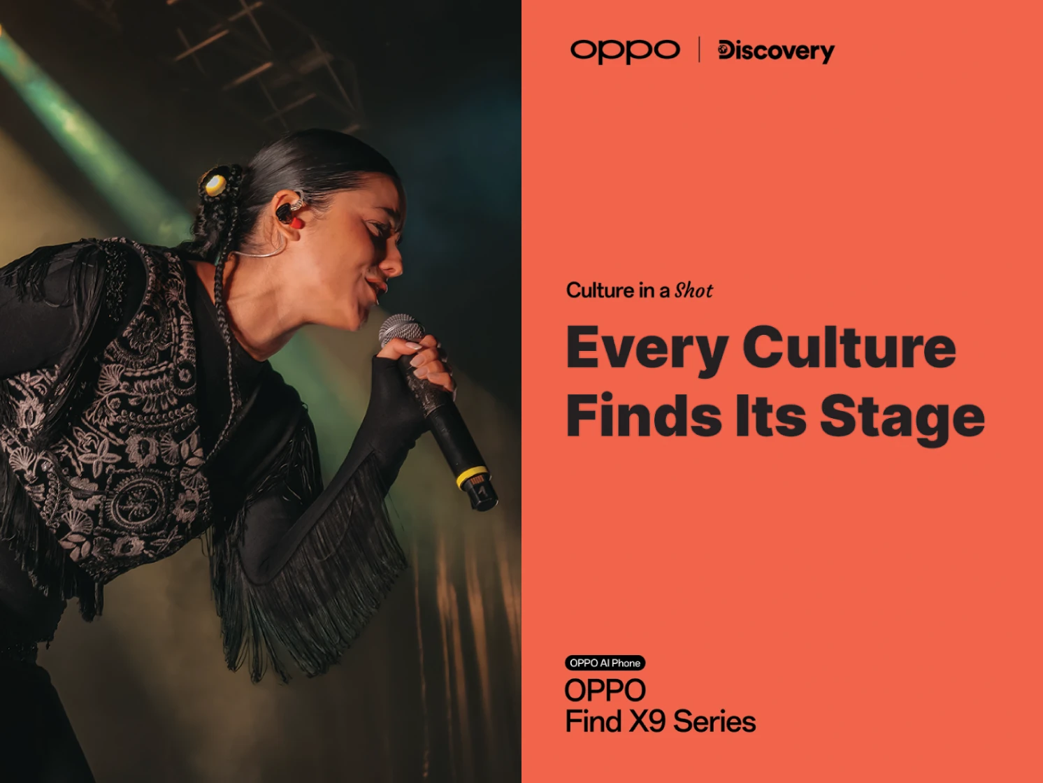 ในปี 2025 OPPO และ Discovery Channel สานต่อโครงการ Culture in a Shot บันทึกความงดงามของวัฒนธรรมจากกว่า 15 ประเทศและภูมิภาค ผ่านบทพิเศษ "Every Culture Finds Its Stage" ถ่ายทอดการแสดงทางวัฒนธรรมด้วยเลนส์ของ OPPO Find X9 Series