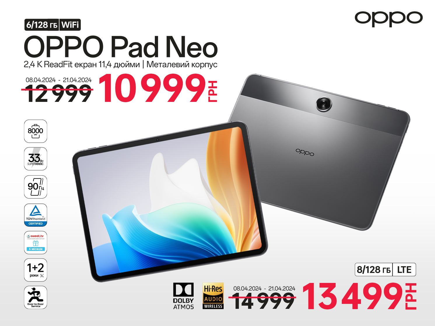 Звичайна ціна ОРРО Pad Neo (8/128 Гб) LTE 14999 грн. Акційна ціна 13499 грн (08/04—21/04).