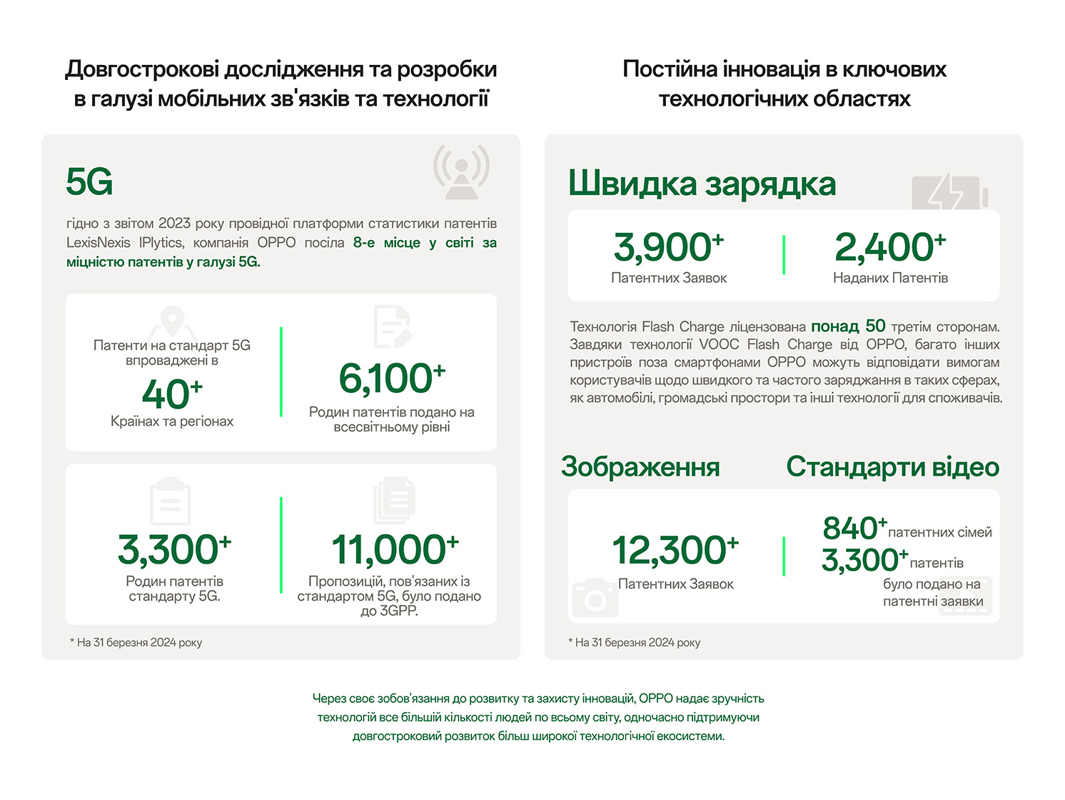 На сьогоднішній день OPPO впровадила основні стандартні патенти 5G у більш ніж 40 країнах і регіонах світу. Вона також подала понад 6 100 заявок на глобальні патенти, задекларувала понад 3 300 патентів на стандарти 5G в Європейському інституті телекомунікаційних стандартів (ETSI) і подала понад 11 000 пропозицій, пов'язаних зі стандартом 5G, в рамках Проекту партнерства 3-го покоління (3GPP). В інших сферах OPPO подала понад 12 306 заявок на патенти, пов'язані з обробкою зображень, і надала ліцензію на свою технологію флеш-зарядки VOOC більш ніж 50 компаніям, що дозволило створити більше електронних пристроїв з можливістю швидкої зарядки.