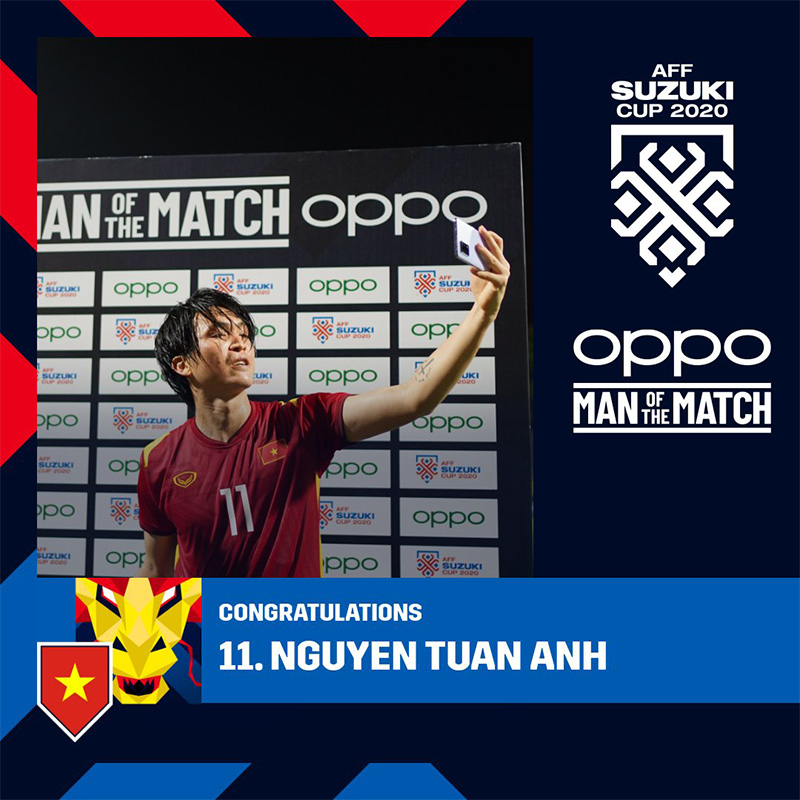 Nguyễn Tuấn Anh, cầu thủ số 11 của đội tuyển Việt Nam với sự những pha kiến tạo xuất sắc đã nhận danh hiệu “Man of the Match” của OPPO với phần thưởng là một chiếc smartphone A95. Sau khi nhận phần thưởng, chàng cầu thủ tài hoa nhưng đã hai lần lỡ hẹn với AFF Cup làm động thái selfie với chiếc smartphone A95. Tấm hình này đã xuất hiện trên các phương tiện truyền thông Việt Nam, khu vực và cộng đồng mạng xã hội!
